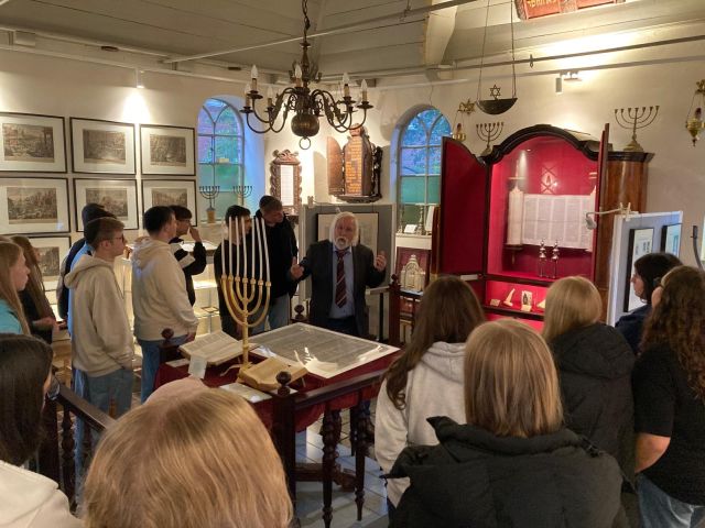 Da staunten die SchülerInnen nicht schlecht: 48 Meter lang ist die Tora-Rolle, die in der Synagoge in Dornum zu sehen ist! Dass die Tora wichtige Gesetze des Judentums enthält, welche über sechs bis sieben Jahre mit angerührter Erde auf Kalbsleder niedergeschrieben wurden und viele weitere interessante Informationen zu Judentum und Synagoge, erhielten die SchülerInnen durch die Worte vom Leiter der Gedenkstätte Herrn Murra-Regner.