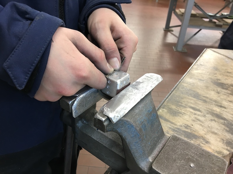 23.01.20 – Es wird gefeilt, gesägt, gehämmert, dass die Funken fliegen: Die Klasse 8 nimmt für 2 Wochen am Berufsorientierungspraktikum (BOP) der KVHS Norden teil. Die Schüler schnuppern dabei in täglich wechselnde Berufsfelder. Neben Krankenpflege standen heute Metallverarbeitung und Bäckerei auf dem Plan. So erhalten die Schülerinnen und Schüler wertvolle Einblicke in Dienstleistungs- und Handwerksberufe. Teil des Projektes ist aber auch eine Potentialanalyse, die verschiedene Anforderungsbereiche des Berufslebens abtestet.
