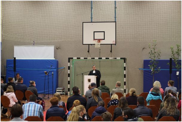 Der alljährlich stattfindende Einschulungs- Gottesdienst wurde, aufgrund der Corona-Regelungen, in die schuleigene Sporthalle verlegt. Dort gab es für alle Anwesenden unter der Leitung unserer Pastorin Cordula Traunert einen rundum gelungenen Gottesdienst, der von Holger Bilker als Berufsmusiker am Akkordeon begleitet wurde.