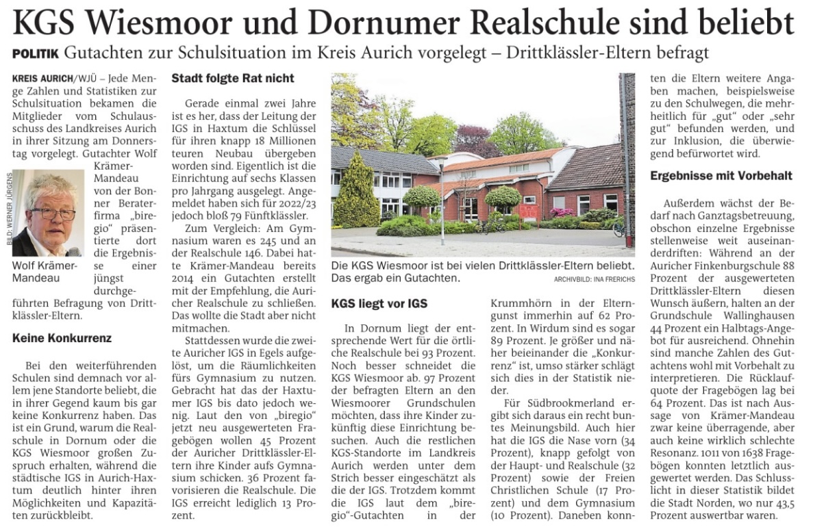 Politik Gutachten zur Schulsituation im Kreis Aurich vorgelegt – Drittklässler-Eltern befragt. (Quelle: Anzeiger für Harlingerland, vom 28.11.2022)