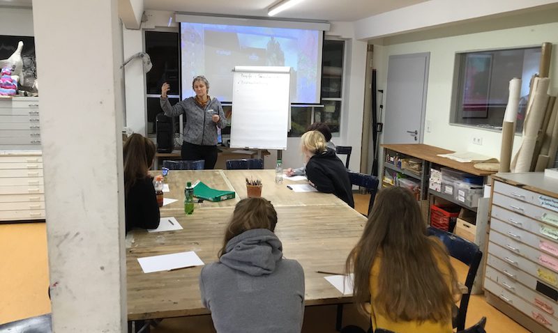 Während die eine Gruppe im Medienzentrum war, besuchte die andere Gruppe die Kunstschule Norden. Dort konnten sie sich sich schon einmal Werke der ausgewählten Künstlerinnen und Künstler der Kunsttage 2019 anschauen und erste Stichworte sammeln (Foto).
