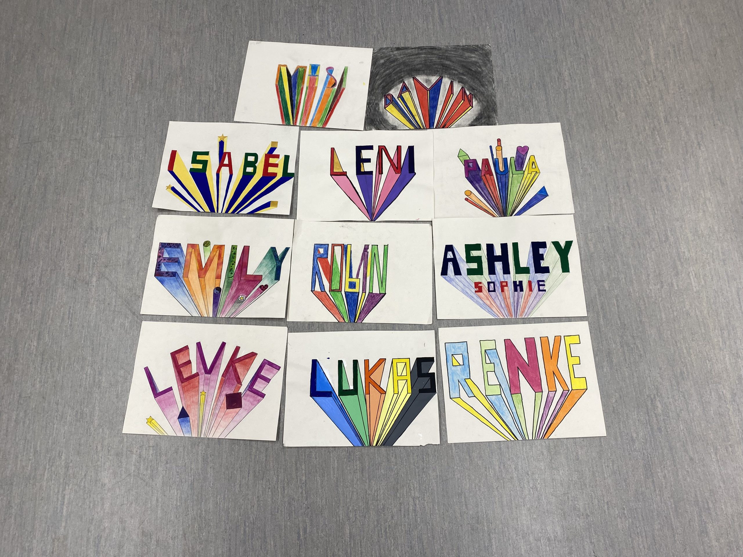 Das Bild zeigt das Thema „Zentralperspektive“: die Schülerschaft sollte ihren jeweiligen Namen mit Details, die zu ihnen passen, kreieren.