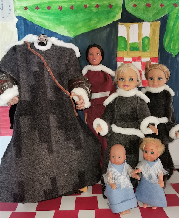 28.05.20 – Eine besondere Zusatzaufgabe hatten die Schüler der Klasse 5 in ihrem Wochenplan: Die beiden großformatigen Familienporträts aus dem Rittersaal sollten mit eigenen Mitteln nachgestellt und dann fotografiert werden. Marten hat sich der freiwilligen Bonusaufgabe gestellt. Sein gelungenes Werk ist hier unter dem Beitrag zu sehen. Er schreibt zu seinem Bild: „Ich habe sehr lange gebraucht. Bis gestern Mitternacht. Ich habe erst alles für die Kleider zusammengesucht. Papas alten schwarzen Schal und sein rotes Tshirt zerschnitten. Die Haare von den Barbies durfte ich nicht schneiden. Habe sie nur mit Gummibändern zusammen gemacht. Den Fussboden habe ich geklebt. Ein grosses Blatt mit vielen roten Vierecken. Der Hintergrund ist getuscht. Die Babys haben Kleider aus dicken blauen Stoffservietten. Erst hat Mama mir geholfen zu nähen. Ich habe dann alles geklebt mit Heisskleber.“